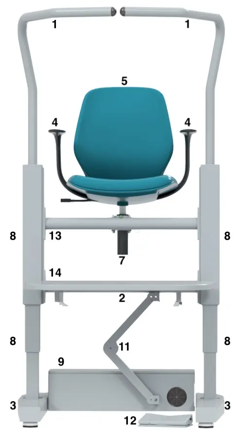 • The Upper System Frame (13): Engineered for clinical versatility, it features a integrated quick-connector for the Seat Frame (6). This allows the seat (5) to be securely mounted or removed using only a single screw, enabling rapid transitions between standing and seated analysis.