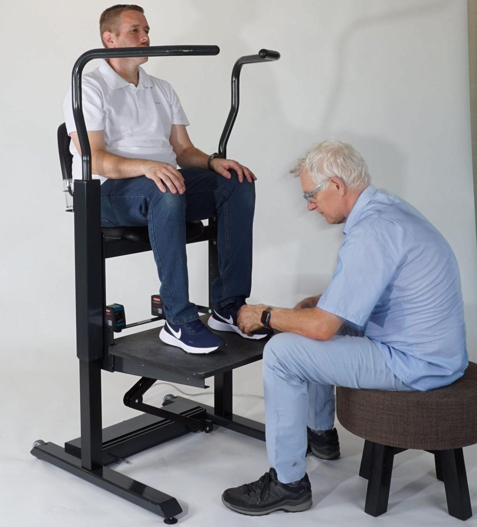 Clients experience more comfort on the Orthostand One with a comfortable PU seat and back during the often long measurement and fitting sessions. Clients are supported by solid safety bar supports in standing, semi-standing and seated positions.